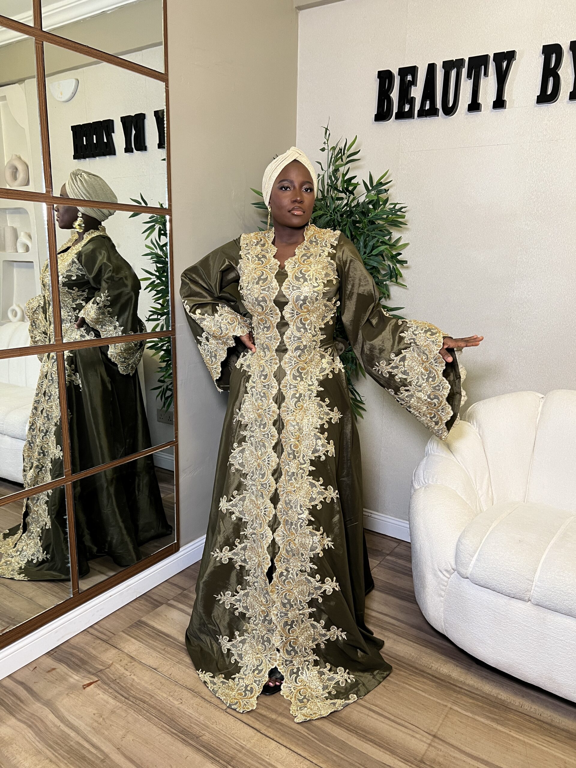 High quality lush taffeta embellished with lace, comes with a turban or headband to match.